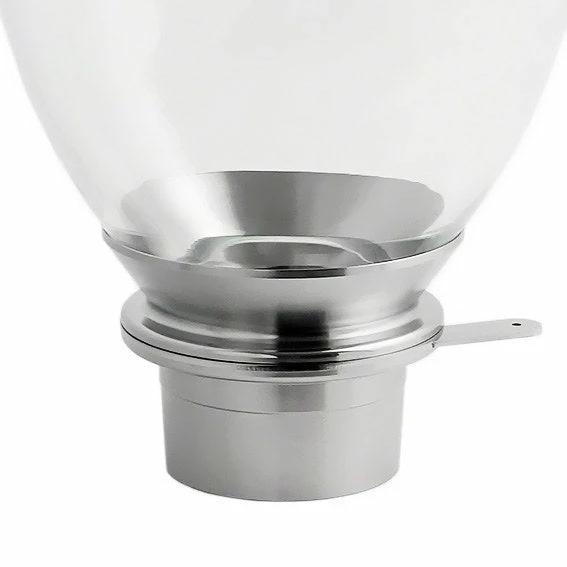 Hand-blown crystal optics glass hopper with full metal Inox glass adapter of your choice to be used with Mahlkonig, Mazzer, Macap, Compak and Elektra grinders and models. Hand-polished high gloss finish adapter and lid. Glass mounted with food grade silicone.
