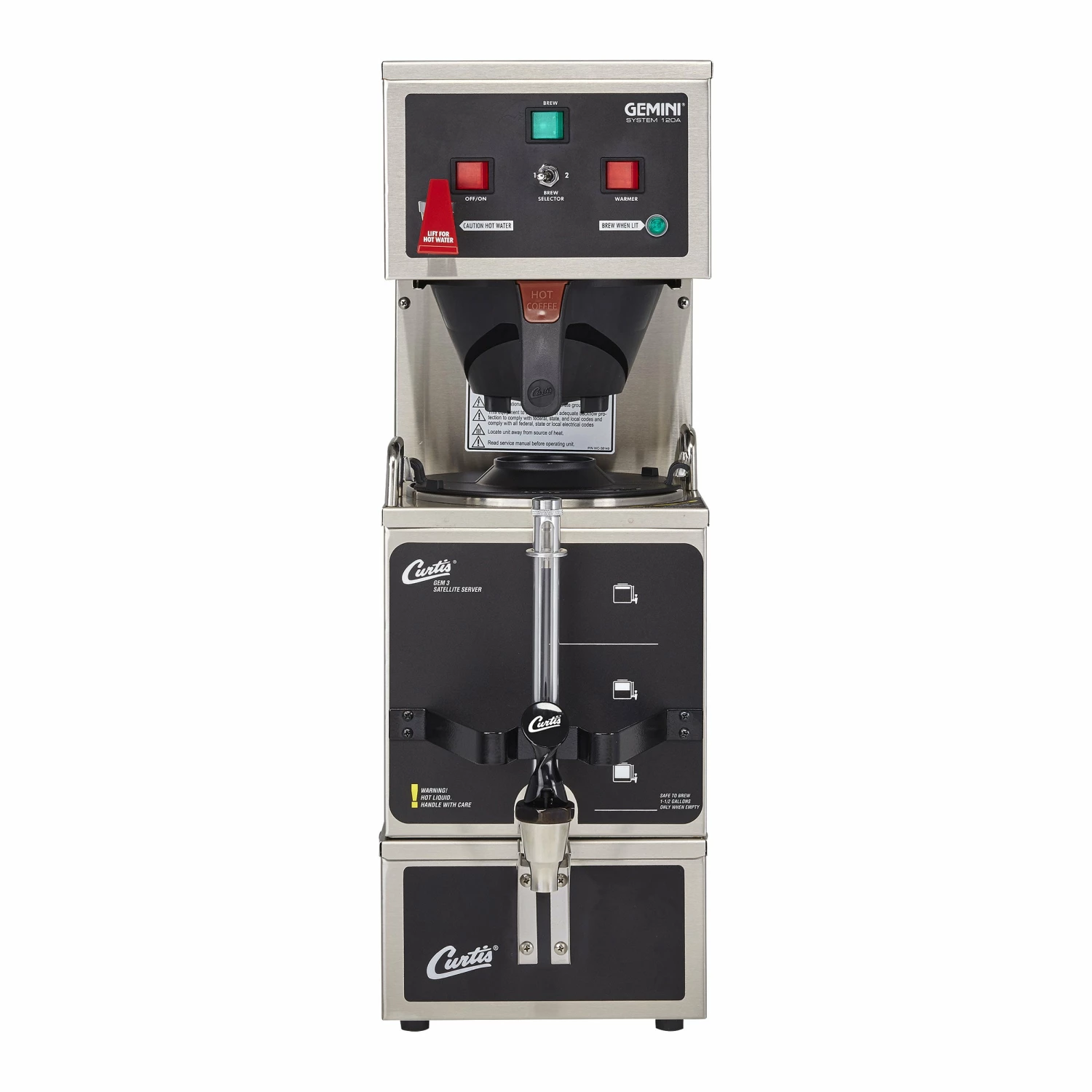 The Gemini System 120A conveniently and automatically brews 12 or 24 cups of rich, full-bodied coffee per cycle into a 36-cup insulated Satellite Server. A brew-ready light signals when the water temperature is ready for the next brewing cycle. This full-featured brewer conveniently plugs into a conventional 115V wall outlet.