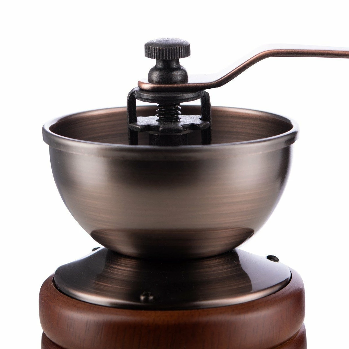 This manual coffee grinder offers professional results for the coffee connoisseur in an organic earth-friendly design made of metal and wood. Its compact design is ideal for travel or kitchens with limited space.